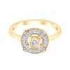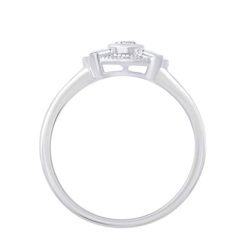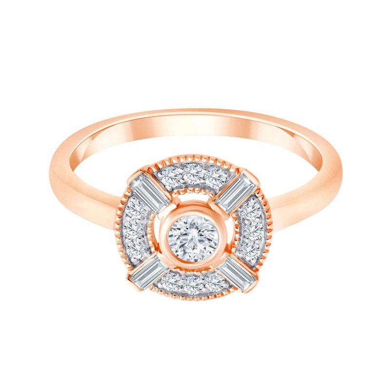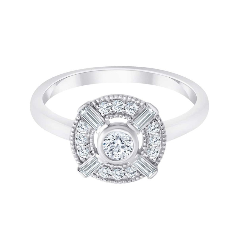 4 diamants taille baguette donnent à la bague Jacqueline une touche vintage dont la délicatesse est apportée par le jour entre le diamant de centre et le halo de diamants qui l'entoure.