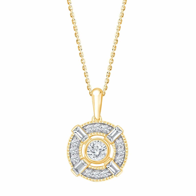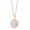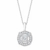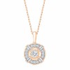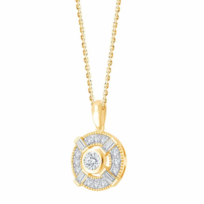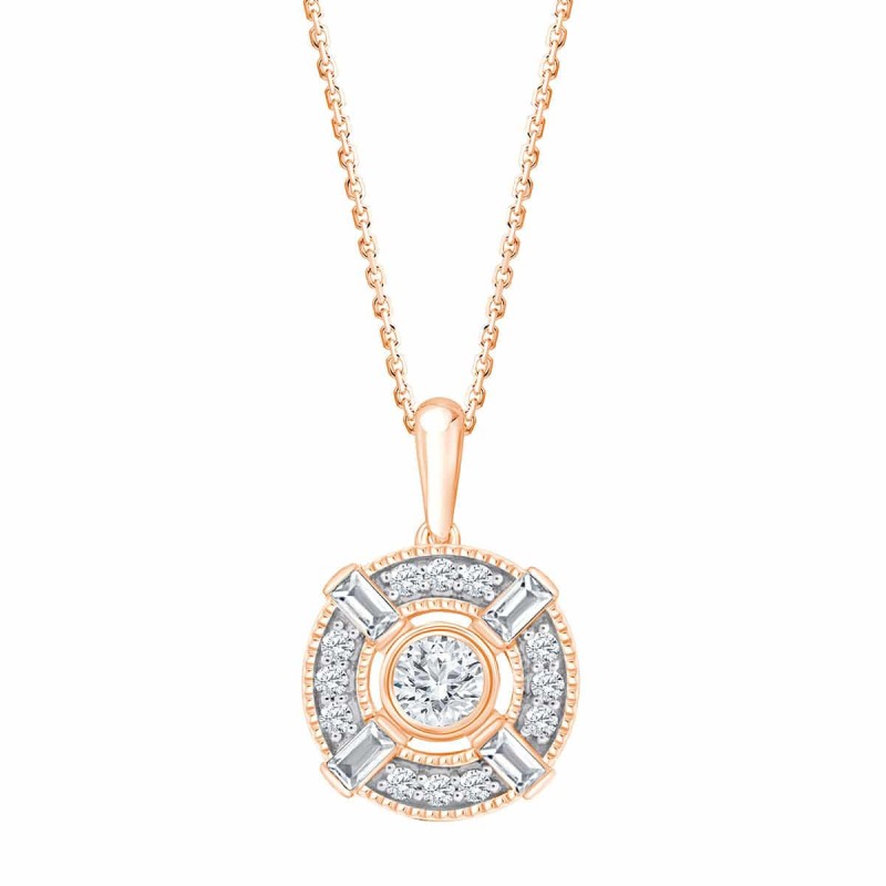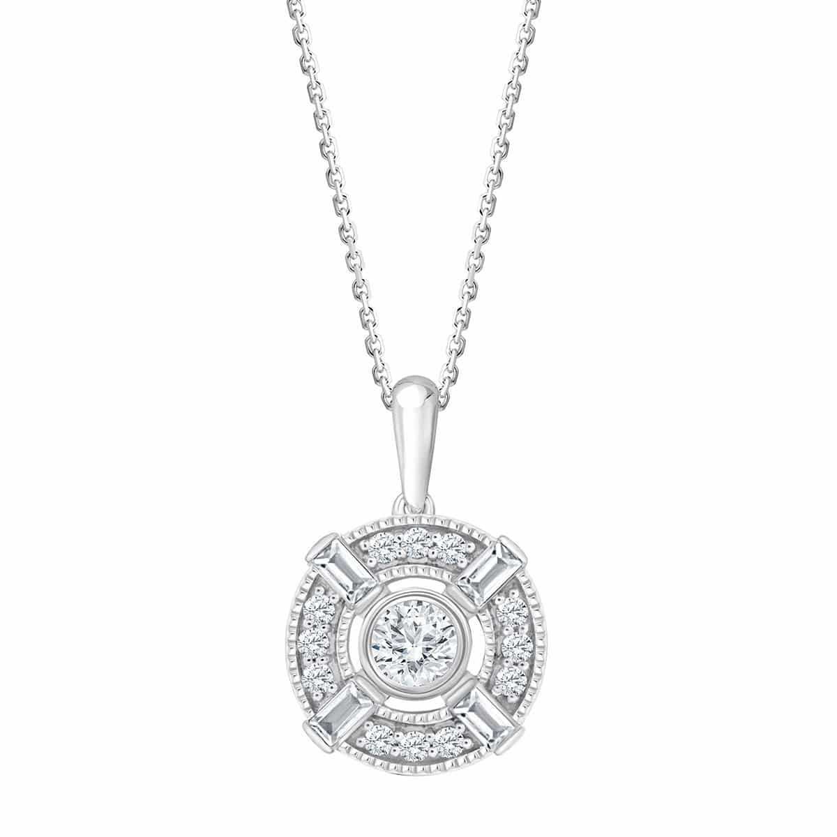 4 diamants taille baguette donnent au collier Jacqueline une touche vintage dont la délicatesse est apportée par le jour entre le diamant de centre et le halo de diamants qui l'entoure.