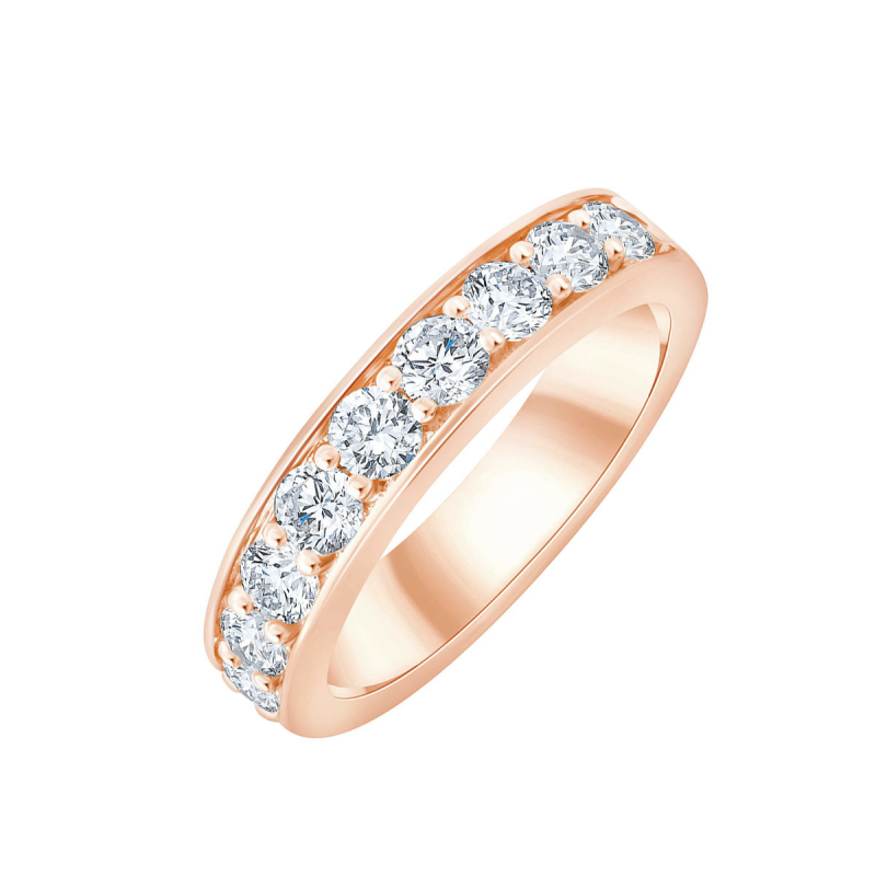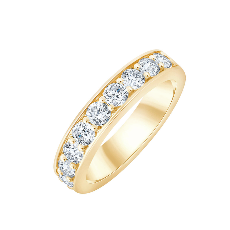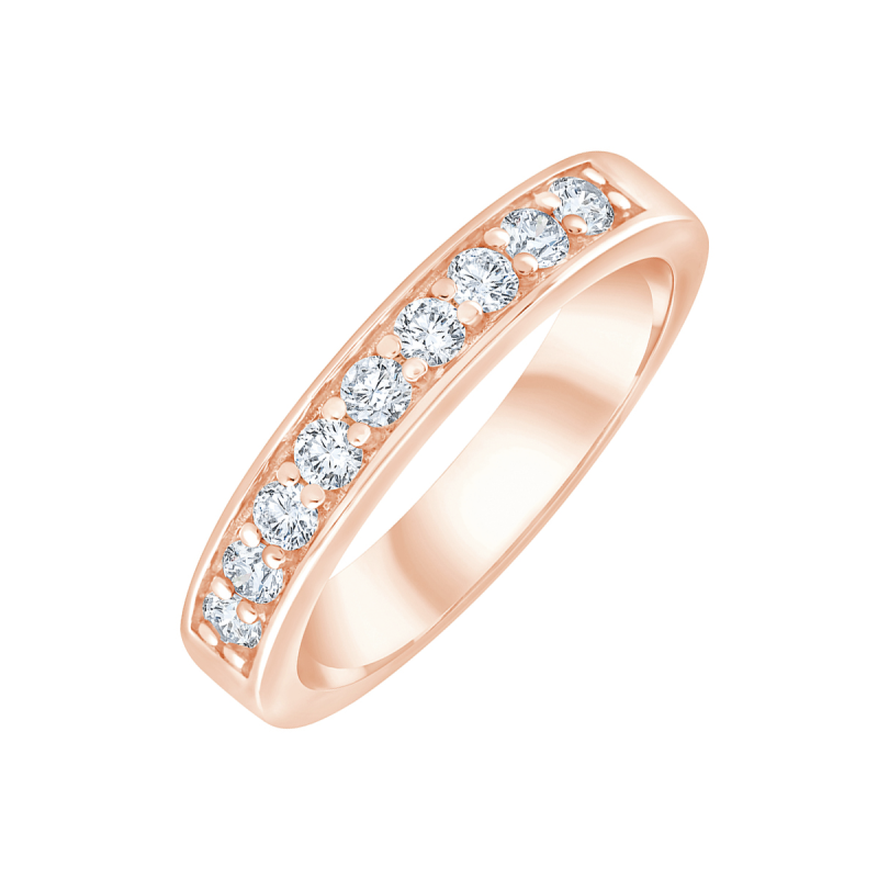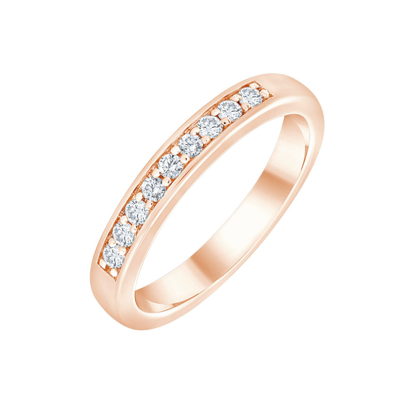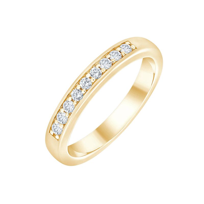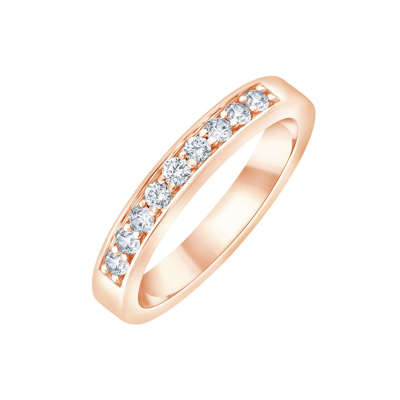 Sertie de 9 diamants cette alliance reprend l'esthétique du serti griffes et la robustesse du serti rail.