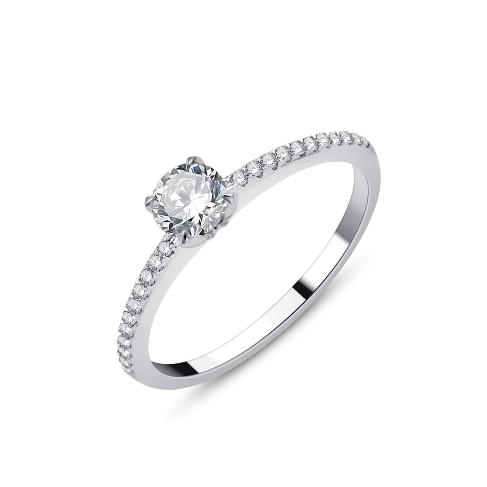 Ce solitaire accompagné est un magnifique classique qui se marie parfaitement avec une fine alliance diamant sertie griffes. Il est composé de 30 diamants sertis griffes sur le corps de bague pour un poids de 0,14ct et d’un diamant serti 4 griffes de 0,36ct.