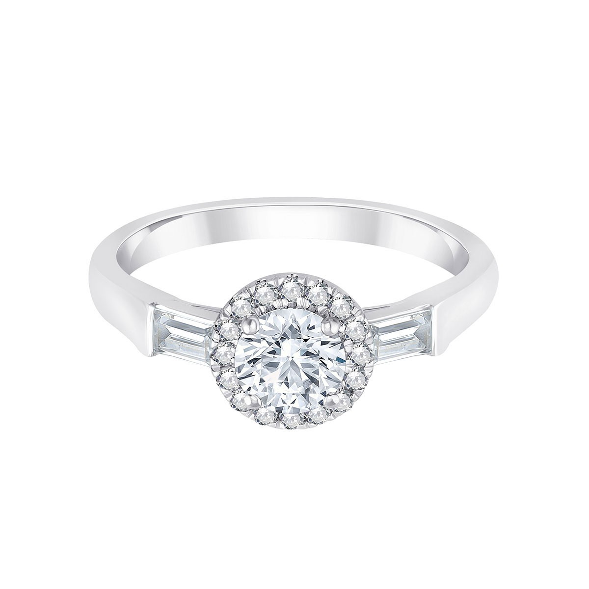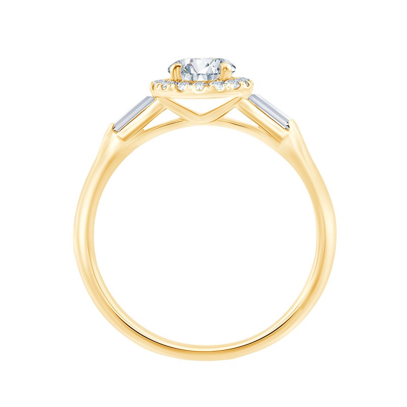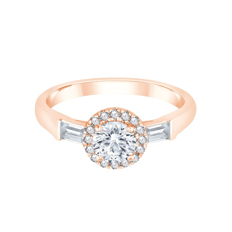 Les diamants taille baguette qui épaulent la pierre de centre et son halo de diamants de synthèse donnent à cette précieuse bague de fiançailles un look rétro qui nous plaît beaucoup.