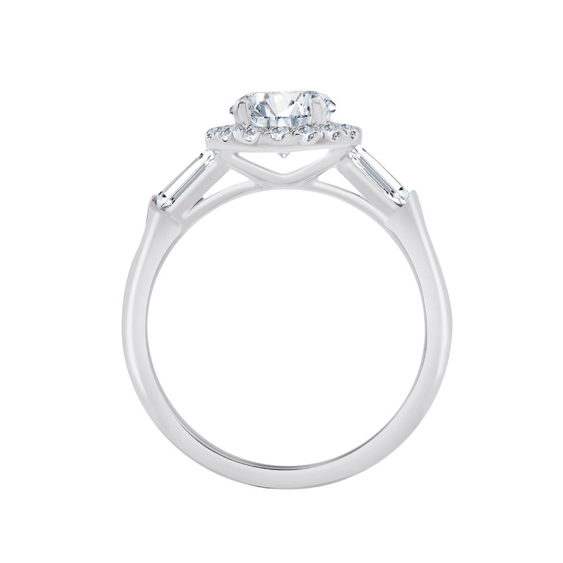 Les diamants taille baguette qui épaulent la pierre de centre de forme ronde et son halo de diamants de synthèse donnent à cette précieuse bague de fiançailles un look rétro qui nous plaît beaucoup.