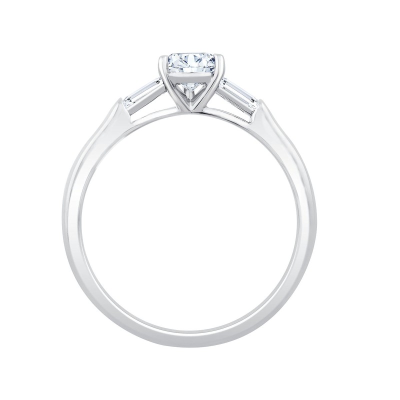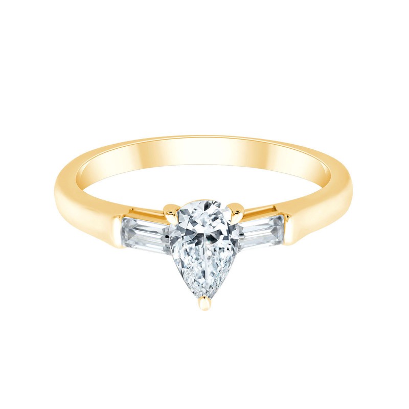 Les diamants taille baguette qui épaulent la pierre de centre de forme poire de 0.50 carat donnent à cette précieuse bague de fiançailles un look affirmé légèrement rétro qui nous plaît beaucoup.