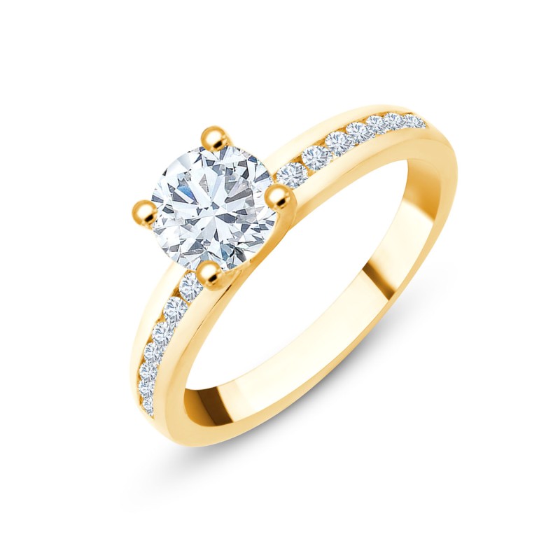 Alexine est un solitaire accompagné dont la monture cossue est sertie d'une rangée de 16 diamants taille brillant. En son centre un diamant taille brillant certifié de 1 carat est serti par 4 griffes.