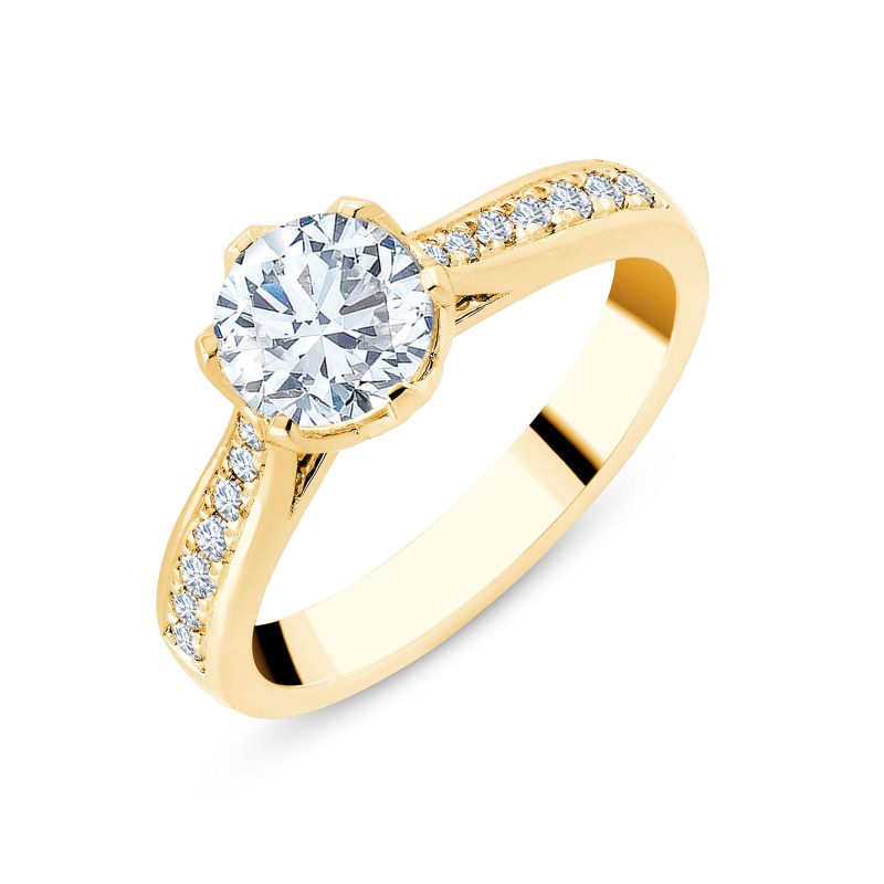 14 diamants sont sertis avec la technique du serti grains sur l' anneau de la bague. Le panier qui accueille le diamant de centre certifié d'un poids de 1.00 carat a été travaillé comme une tulipe à 6 pétales.