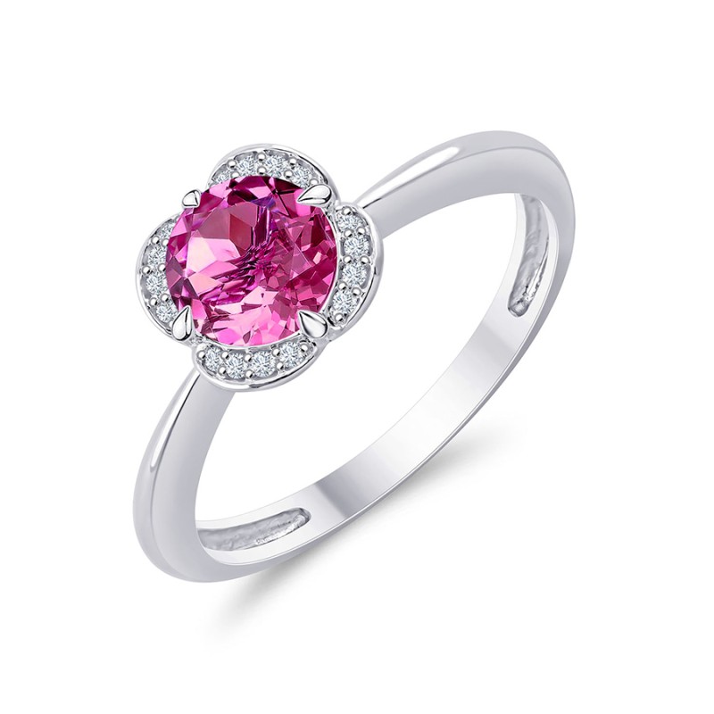 Une Topaze Rose de 6 mm est sertie sur une monture en or 375 millièmes et diamants.
