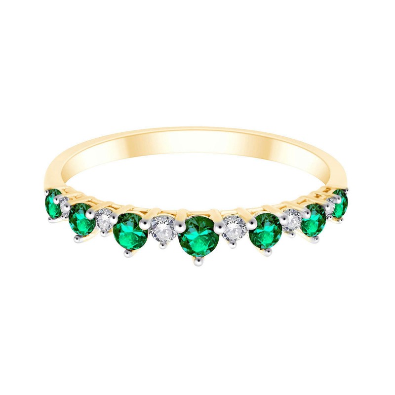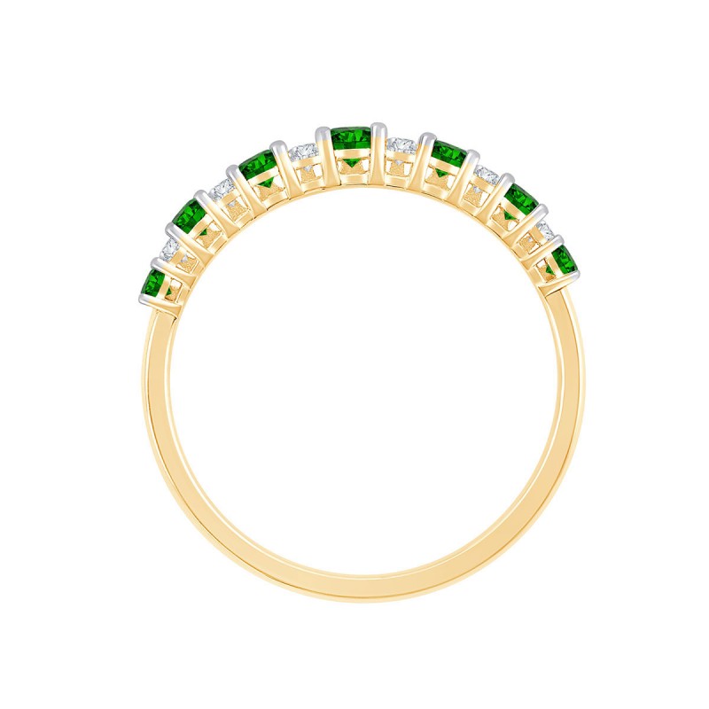 Diamants et émeraudes sont sertis en alternance sur un anneau en or 18 carats. Les griffes se font discrètes pour laisser la part belle au rythme créé par ce précieux duo. Les pierres sont libres, comme suspendues à un fil précieux.