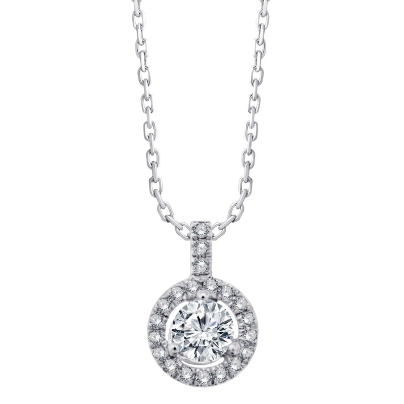 Le collier Izia en or 750 millièmes se différencie par son entourage diamant qui met en valeur le diamant de centre de 0.18 carat. Une bélière sertie de diamants donne à ce pendentif une belle stabilité.