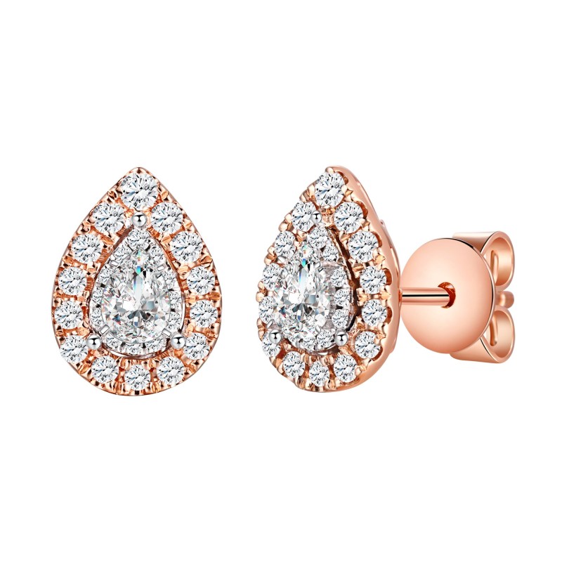 Sertis sur une monture en or 18 carats, 2 x 26 diamants taille brillant forment les halos autour de deux diamants taille Poire de 0.10 ct chacun.